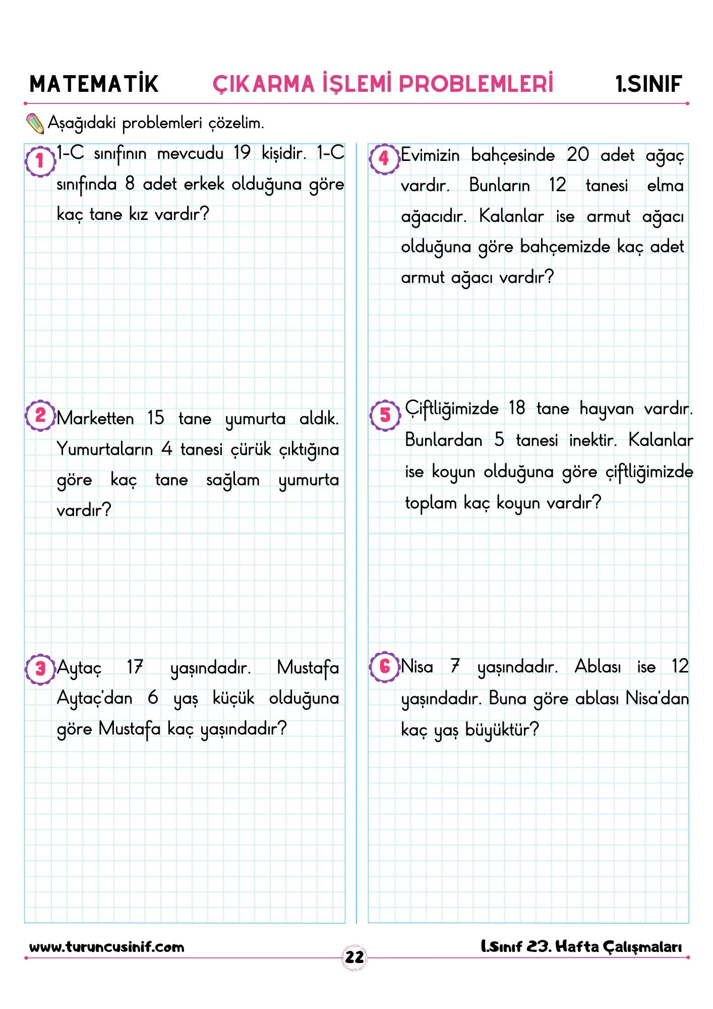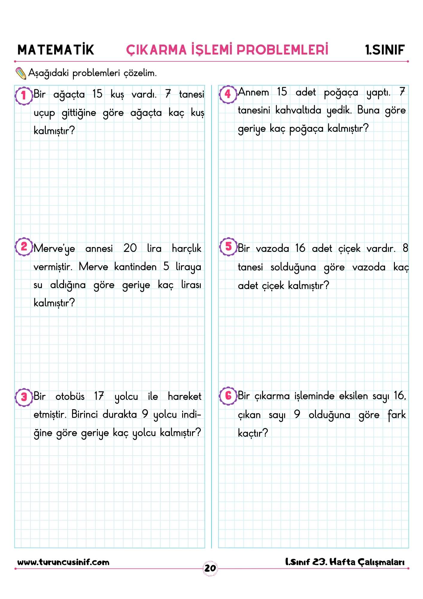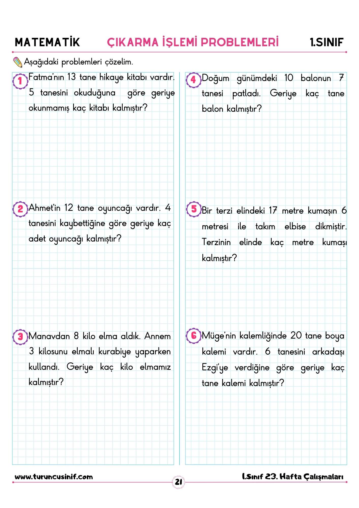 Matematik dersinde 1. sınıf çıkarma problemleri çalışma sayfası, öğrencilerin matematiksel düşünme becerilerini geliştirirken aynı zamanda günlük yaşamda matematiği kullanabilme yeteneklerini de artırır. Bu 1. sınıf çıkarma problemleri etkinlikleri, öğrencilerin problem çözme yeteneklerini geliştirirken aynı zamanda matematiği eğlenceli bir şekilde öğrenmelerine de yardımcı olur.