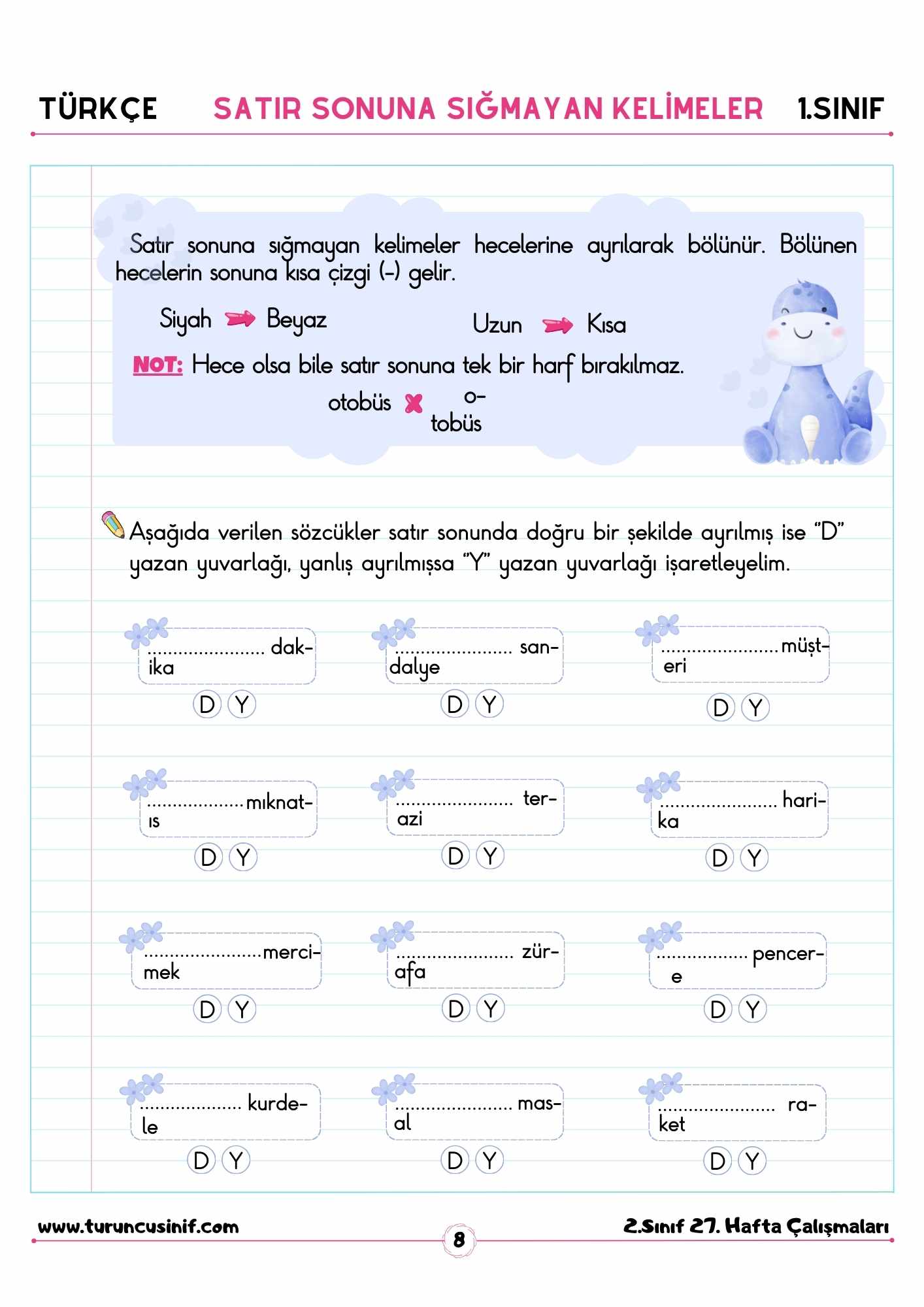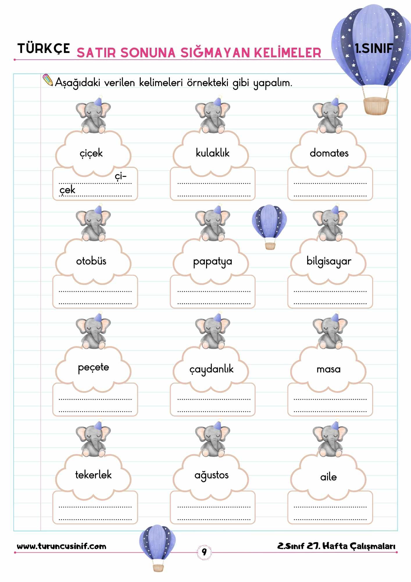 Bu kurallara dikkat edilerek, 1. sınıf satır sonuna sığmayan sözcükler konusu ile ilgili çalışmaları kolayca çözebilirsiniz.