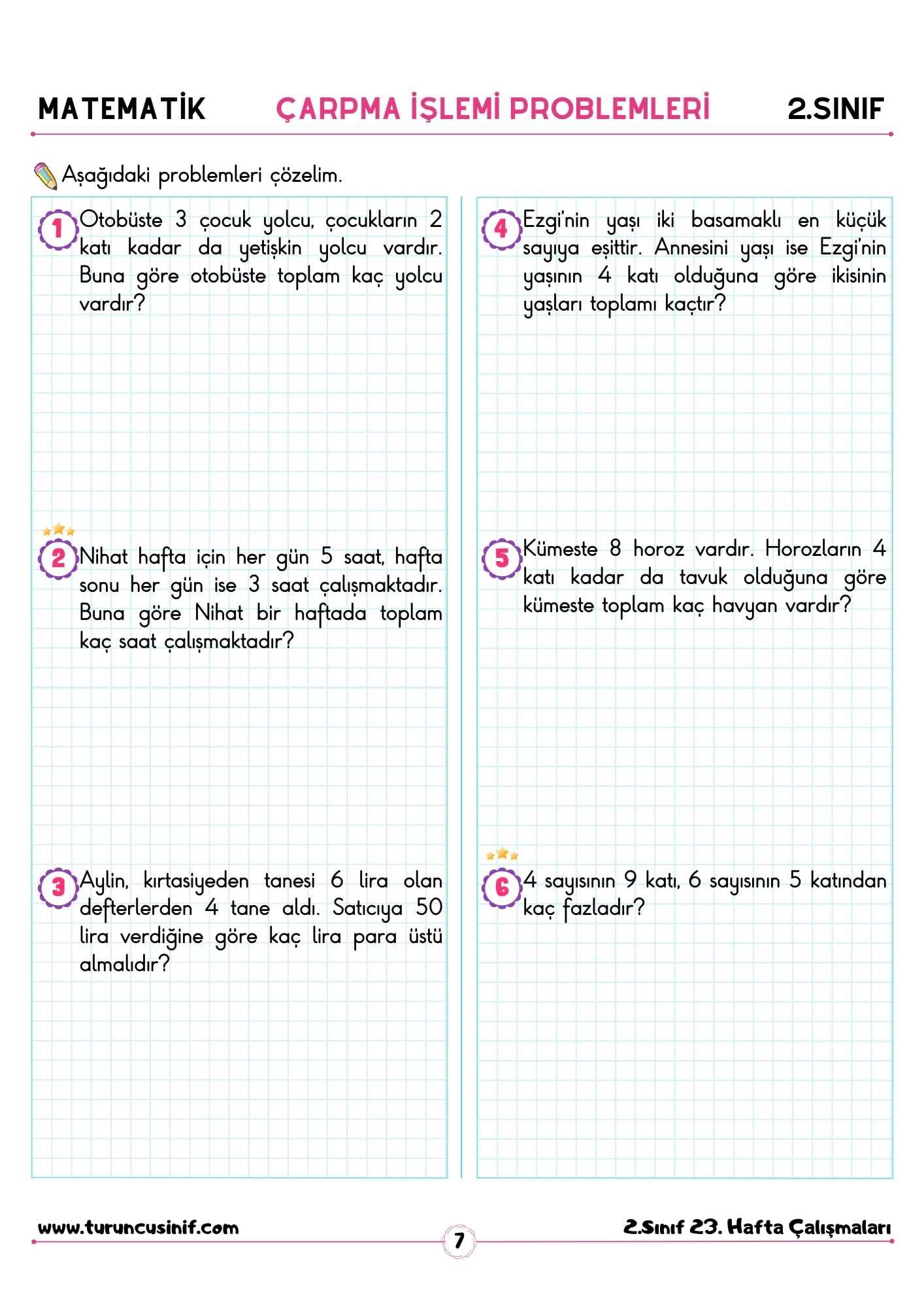 Bu sefer hazırladığımız çalışmalar orta ve zor çarpma problemlerinden oluşmaktadır. Böylelikle öğrencilerin zorlandıkları sorularda daha fazla çalışma yapma imkanı bulacaktır.