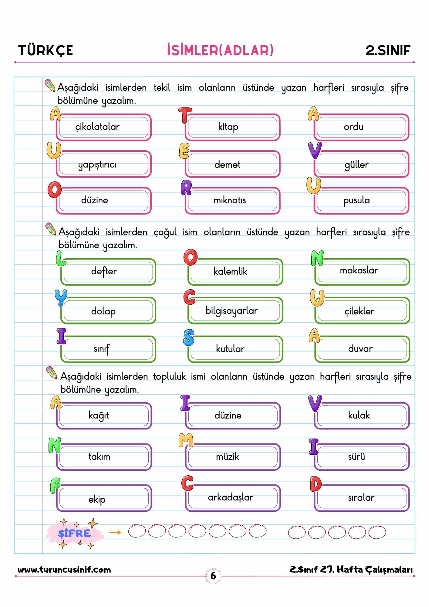 2. sınıf tekil, çoğul ve topluluk isimleri(adları) konusunda ilk olarak karışık varlık adlarını gruplama çalışmasına yer verdik. Sonrasında 2. sayfada 2. sınıf tekil, çoğul ve topluluk isimlerinin karışık verildiği sayfada şifre bulma etkinliğimiz yer almaktadır.