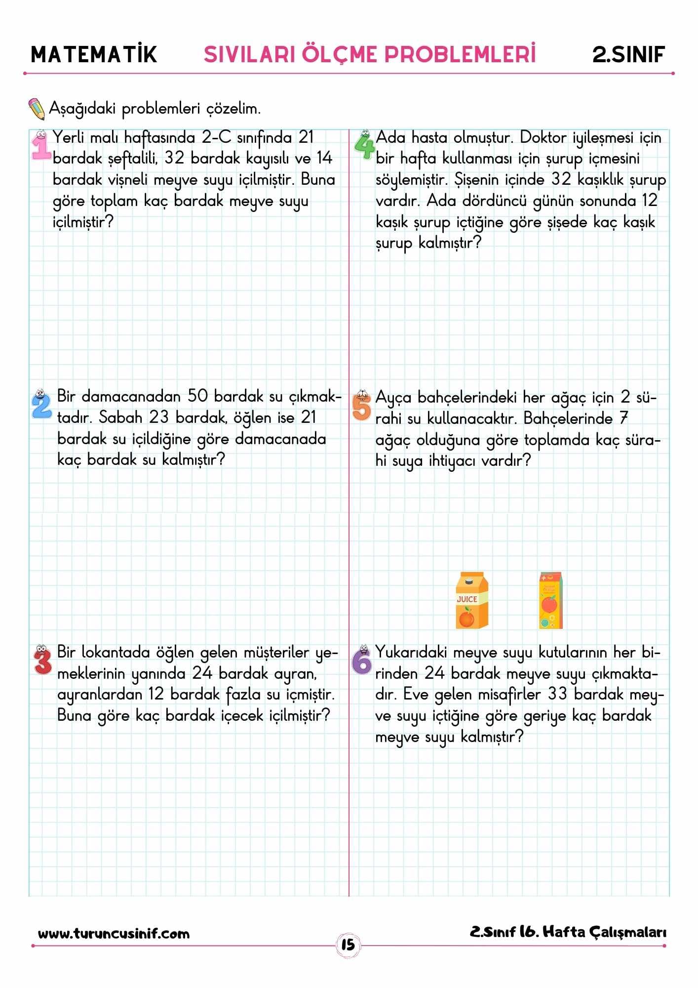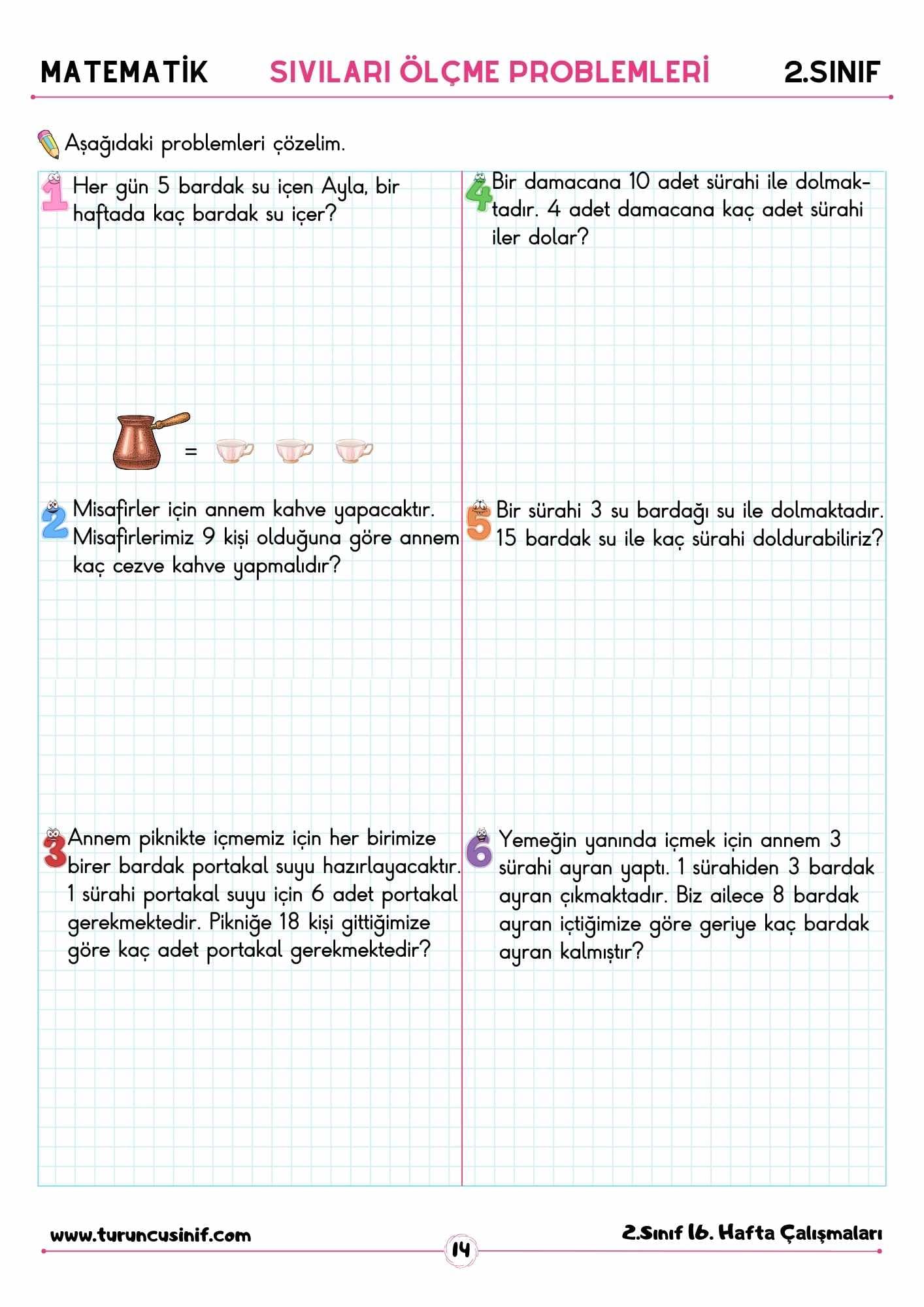 2. sınıf sıvıları ölçme problemleri, 2. sınıf sıvıları ölçme çalışma kağıdı 6 sayfadan oluşmaktadır. Ayrıca sayfanın altında bulunan indir butonuna basarak kolayca indirebilirsiniz.
